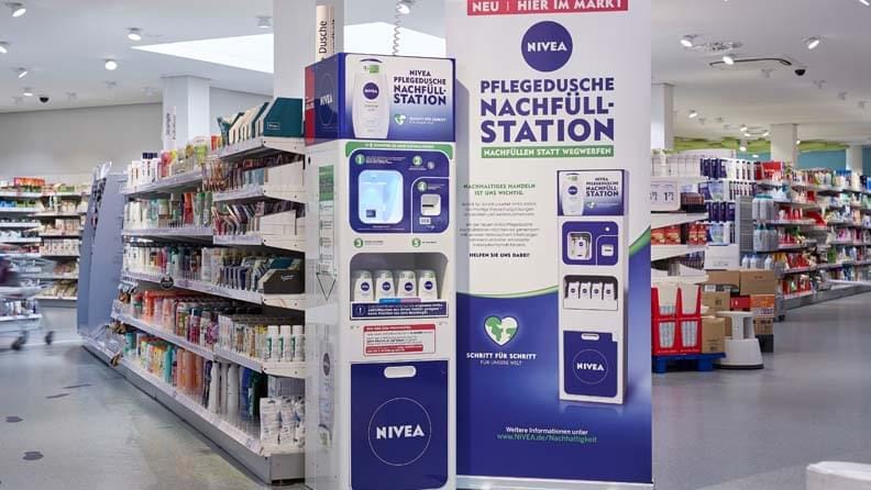 The German cosmetics giant Beiersdorf is trialling the use of refill stations for it’s Nivea shower gels.