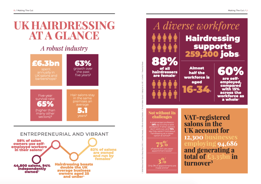 “Up until the beginning of 2020, hairdressing was a robust and growing industry, with survival rates bucking the general decline of the British high street. The Office for National Statistics states that in 2020 there were almost 45,000 hair and beauty salon businesses 1 in the UK (a rise of more than 1,000 since 2019), with barbershops among the top three retail categories that saw the biggest growth in the UK – above supermarkets, coffee shops, takeaways and pizzerias. According to the British Beauty Council 2, £6.3bn was spent in UK salons and barbershops in 2018.