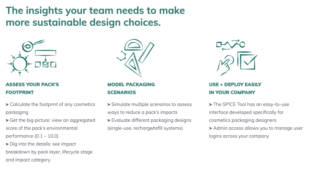 The Sustainable Packaging Initiative for Cosmetics (SPICE), co-founded by global beauty group L’Oréal and leading sustainability consulting firm Quantis, describe the SPICE Tool as an intuitive tool which “makes robust environmental data accessible to packaging designers, empowering them to develop more resilient packaging.”