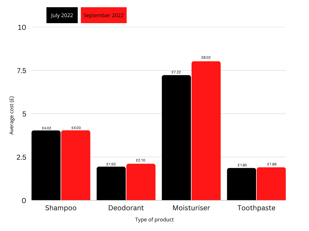 We have zoomed in on the last three months of data from the Office for National Statistics (ONS) and the news doesn’t get any better. Measuring the fluctuating unit price of shampoo, deodorant, moisturiser and toothpaste from July to September, the cost jumps are similar.