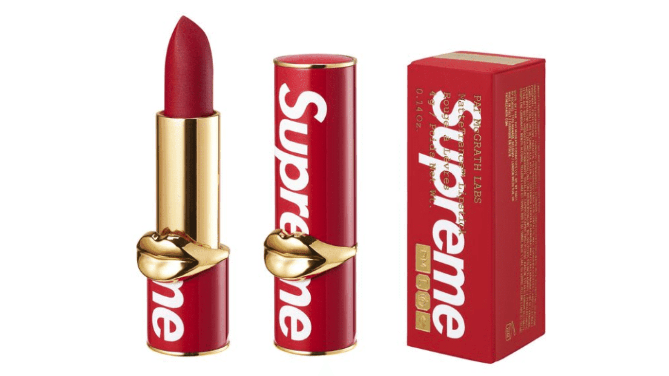 The collaboration – the first-ever for Supreme – includes a limited edition red lipstick, housed in Pat McGrath’s signature gold lip tube, with Supreme branding displayed on the product’s outer packaging.