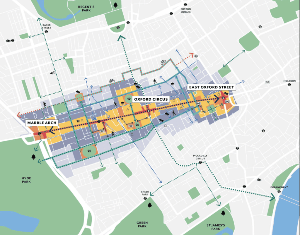 - Focusing investment in the district on three strategically defined areas (Oxford Circus & Bond Street, Marble Arch and also East Oxford Street), with benefits rippling out across the whole District and West End.
