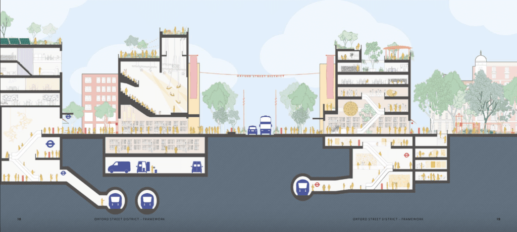 “The Oxford Street District will be an exemplar for sustainable city-making and a test-bed for pioneering approaches. A green, clean destination where signature green spaces and nature may be found across all buildings and streets. A world-class neighbourhood with clean air and streets, zero-carbon energy and transport, with locally sourced produce, and thriving businesses in a circular economy. A habitat for wildlife and a haven for city-dwellers, this will be a place to explore and experience, rather than to simply pass through”.