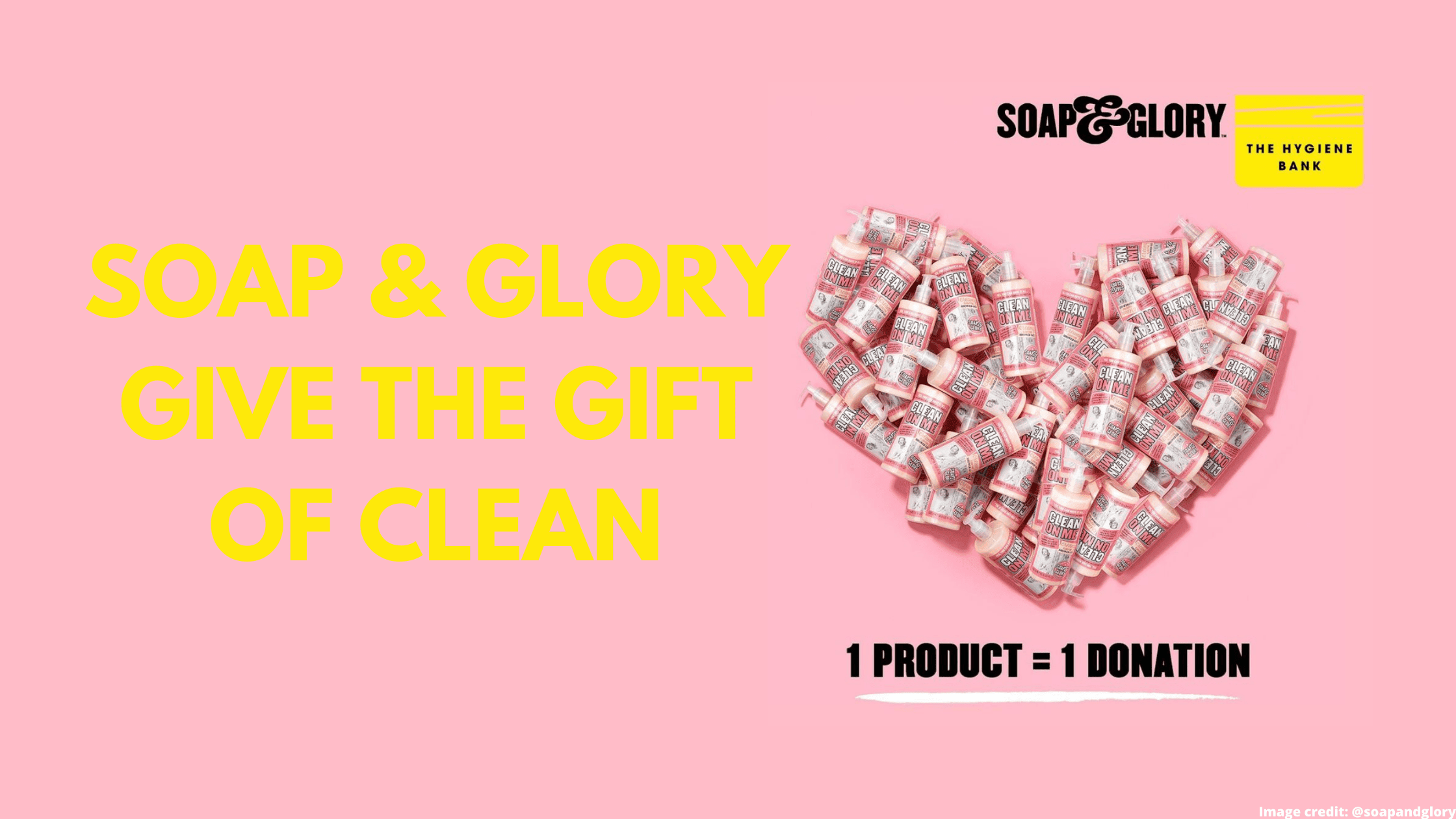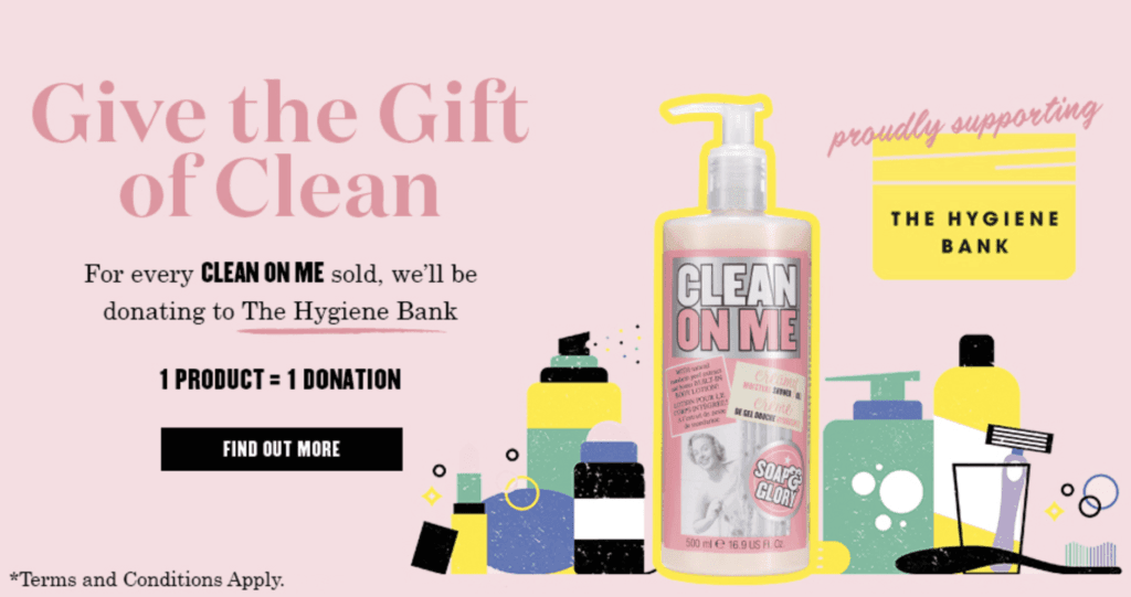 From 13th January – 9th March 2021, Soap & Glory will be giving the Gift of Clean, and donating to The Hygiene Bank; for every Soap & Glory Clean On Me Shower Gel sold, they will donate to The Hygiene Bank.