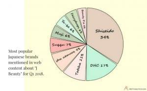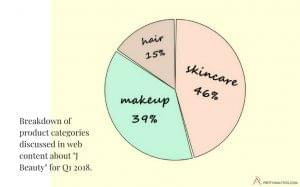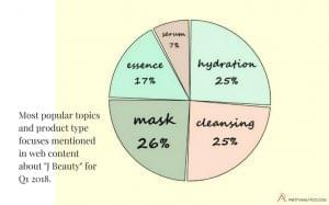Pretty Analytics analysed web content on the topic of “J Beauty” from data points collected in Q1 of 2018. “Cleansing”, “Hydration” and “Masks” were jointly the most popular topics and product type focuses mentioned.